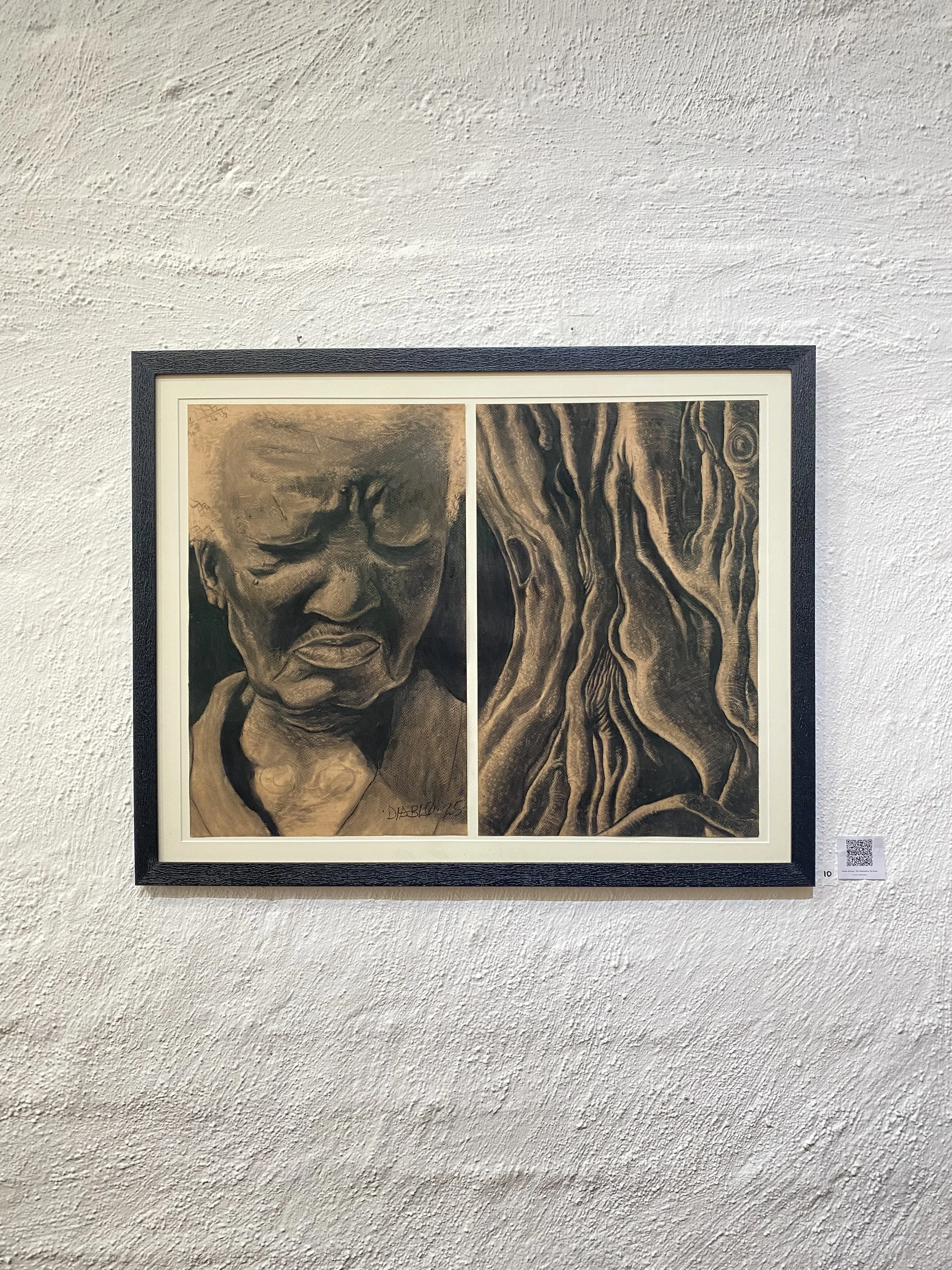 My third interrogation of the theme of home has forced me inward - to a more private reflection on one of the people who has represented home to me, and on the confrontational reflection of self and family. This final piece is yet another diptych which features 2 detailed charcoal drawings – one, a portrait of my Grandmother and the other, a textured re-imagination of the thick layered stem and exposed roots of a Mowana tree (Commonly known as the Baobab tree) - made on beige paper, mounted onto an off-white board and housed within a single wooden-textured frame. This juxtaposition of an aged matriarch and the Mowana tree is echoed throughout this essay, which is meant to be read alongside the visual artwork.